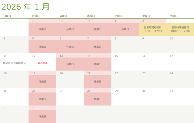 2026年令和八年1月の営業日と営業時間をお知らせいたします