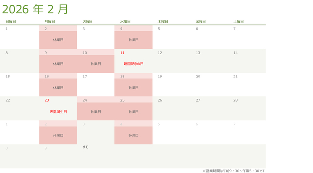 令和八年・2026年2月の営業日のお知らせ